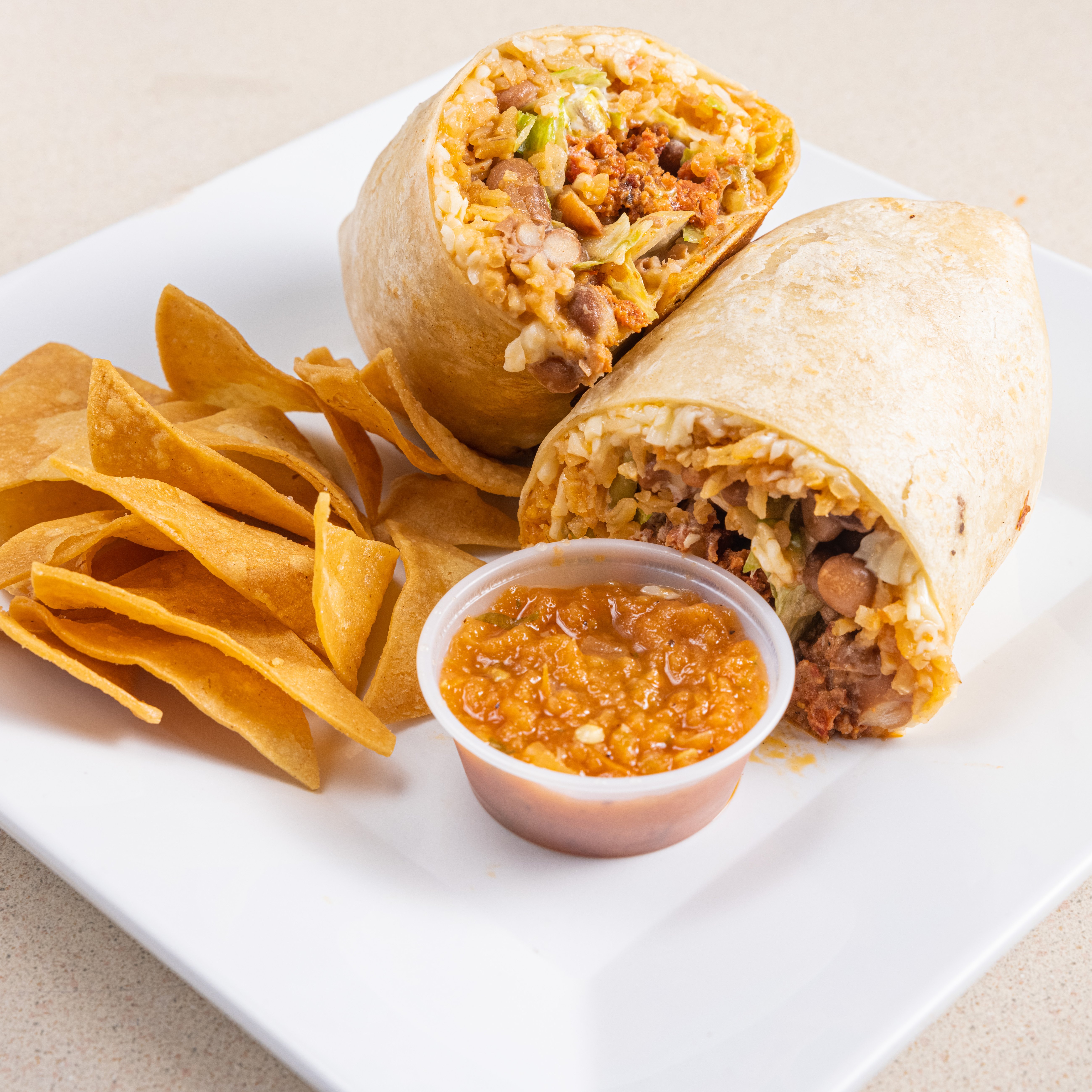 Rice, beans, cheese, lettuce, red sauce & sour cream