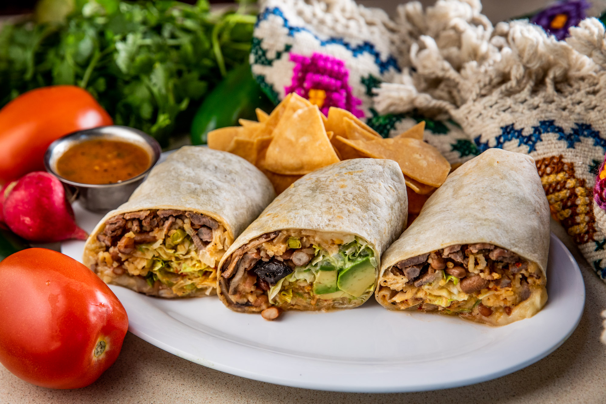 Topped with cilantro, onions, lime wedge, radish. Choice of green, red, or guacamole sauce