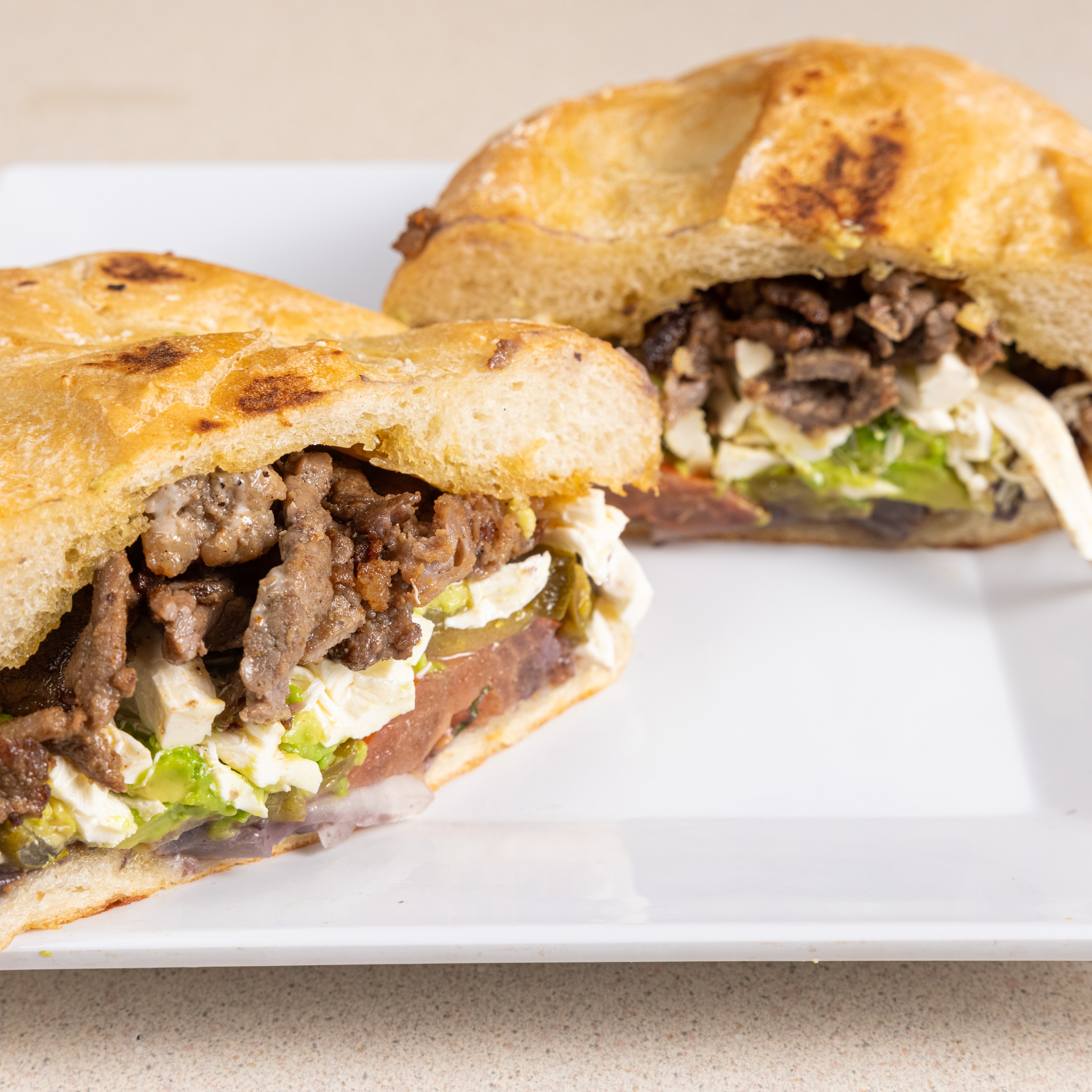 This traditional Mexican sandwich comes with grilled steak, Mexican sausage, topped with melted Mexican cheese. It is served on telera toasted bread, coated with refried beans and mayo, with slices of tomato, onions, a choice of jalapeños or chipotle, fresh avocado.