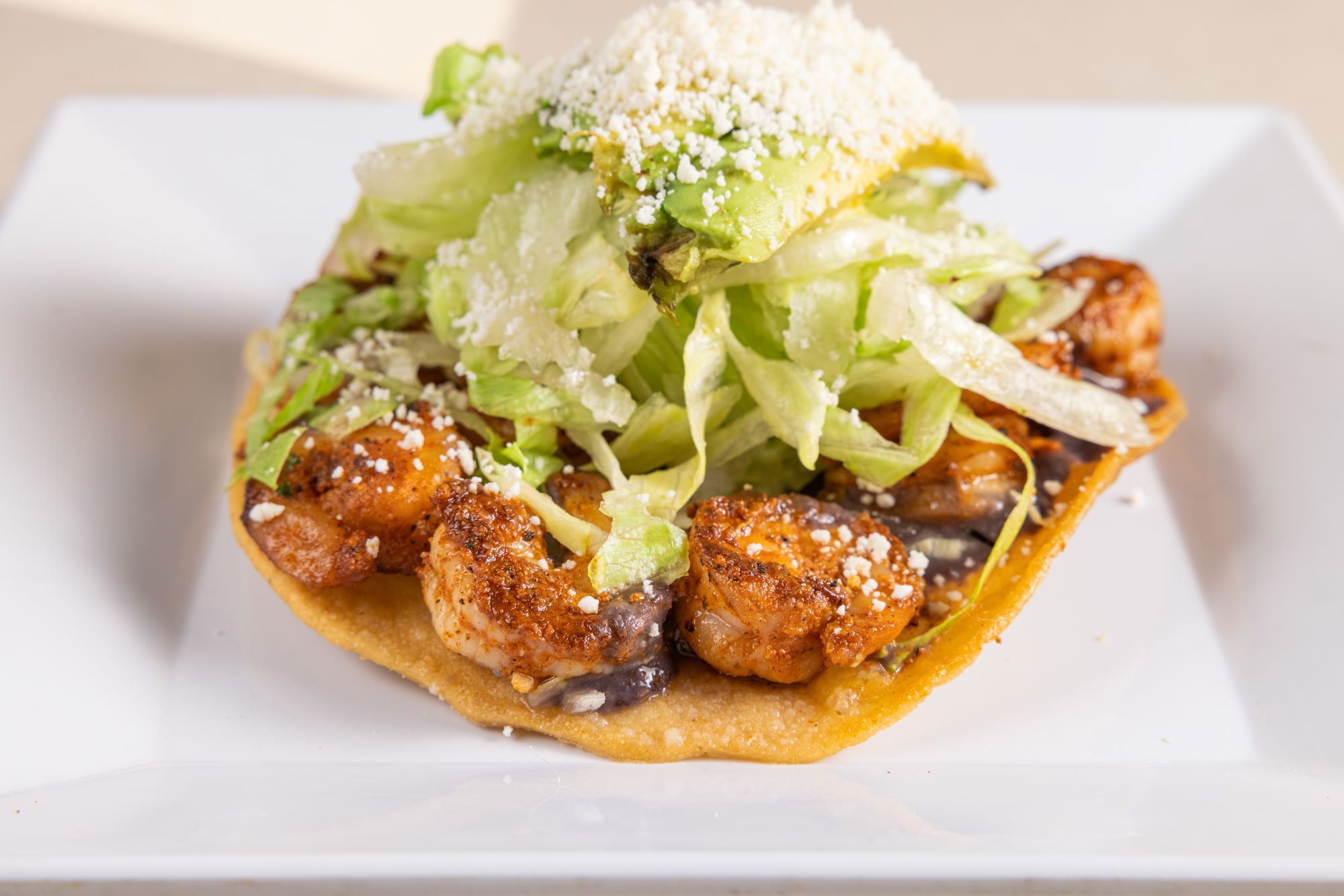Crispy corn tortilla coated with refried beans, lettuce, slices of fresh avocado, and topped with powdered cotija cheese