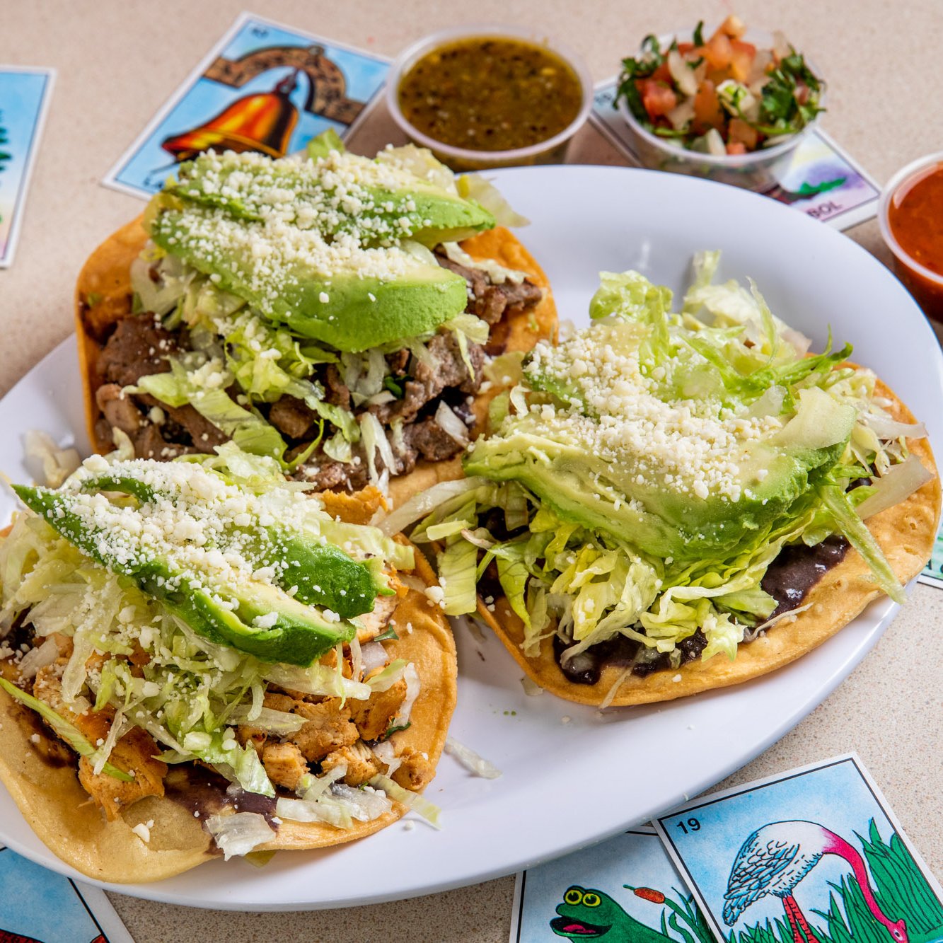 Topped with avocado, Cotija cheese, cilantro, onions, garnished with lime wedge and radish. Choice of green, red, or guacamole sauce