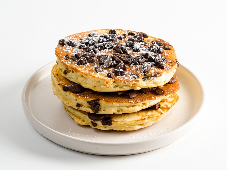 Stack of Buttermilk Pancakes with Chocolate Chunks, Chocolate Syrup & Powdered Sugar