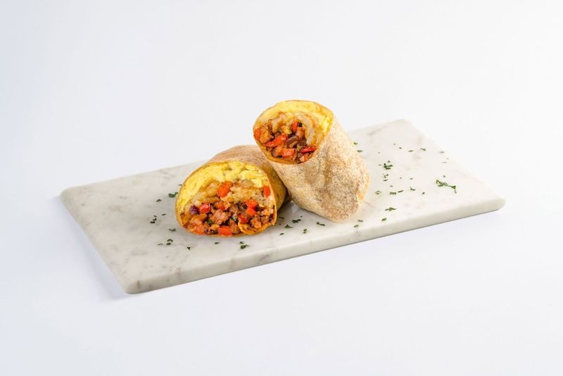 Two Scrambled Eggs, Chorizo, Hashbrown, Pepper Jack Cheese, Pico de Gallo on Whole Wheat Wrap.