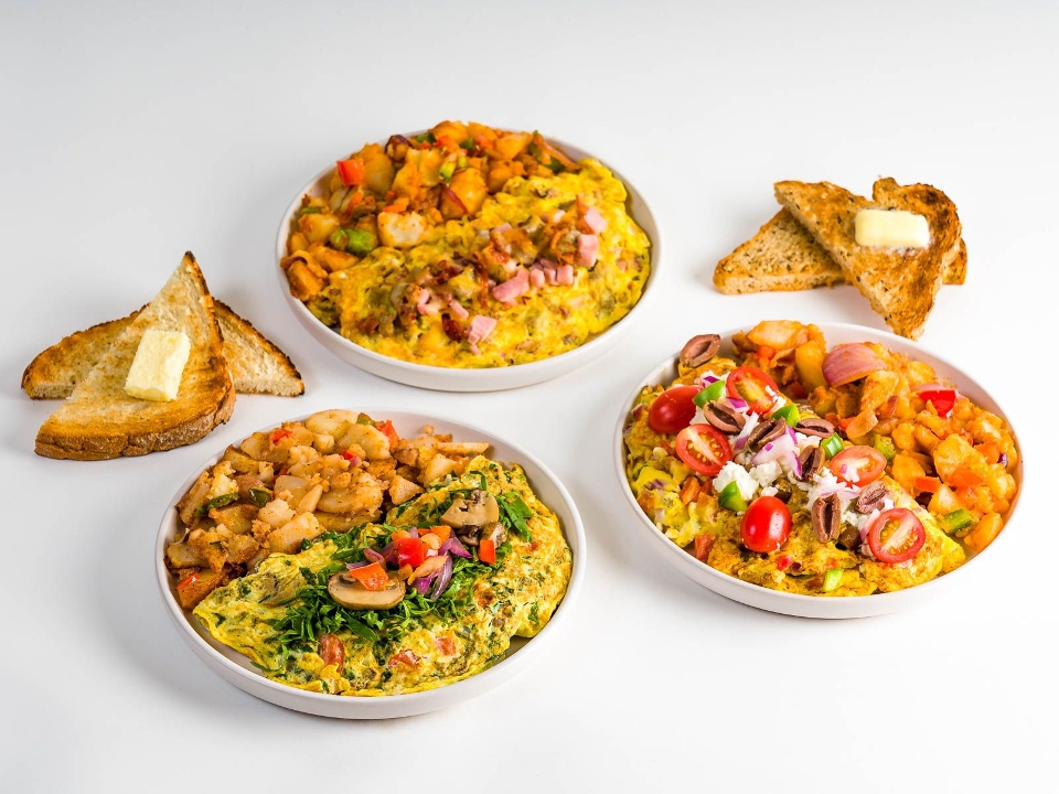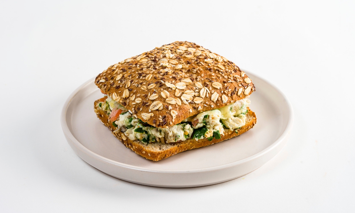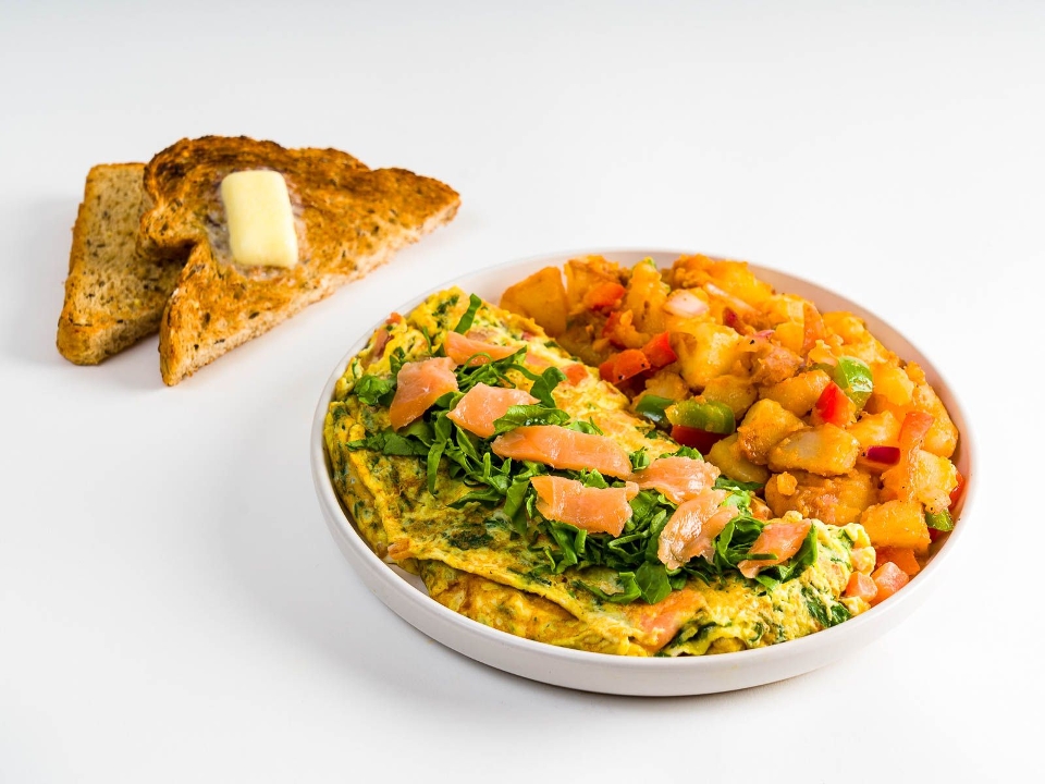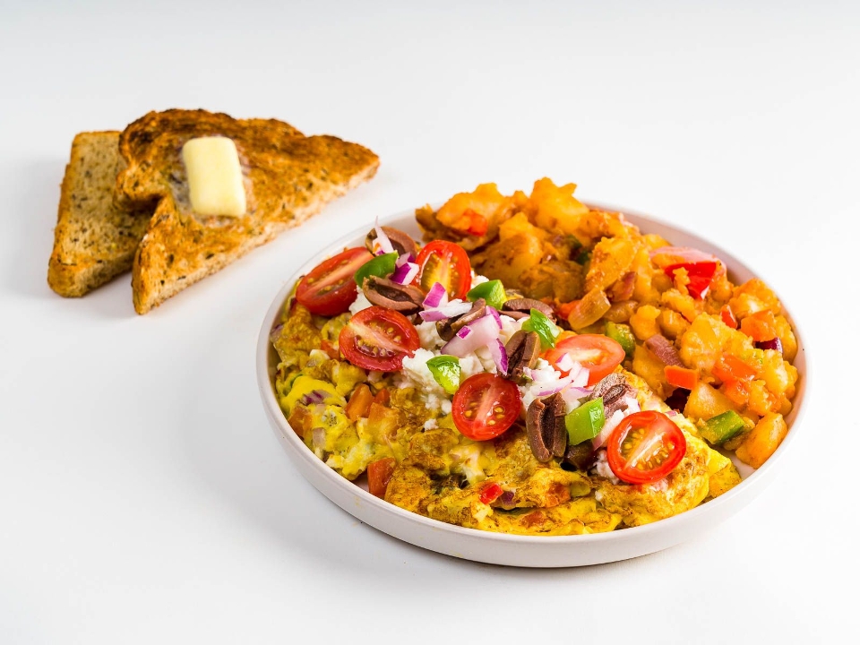 Two Egg Whites, Mushrooms, Spinach, Tomato, Swiss Cheese on 7 Grain Ciabatta Pocket.