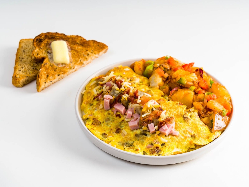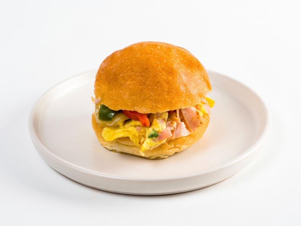 Two Eggs, Country Ham, Green Peppers & Onions on a Brioche.