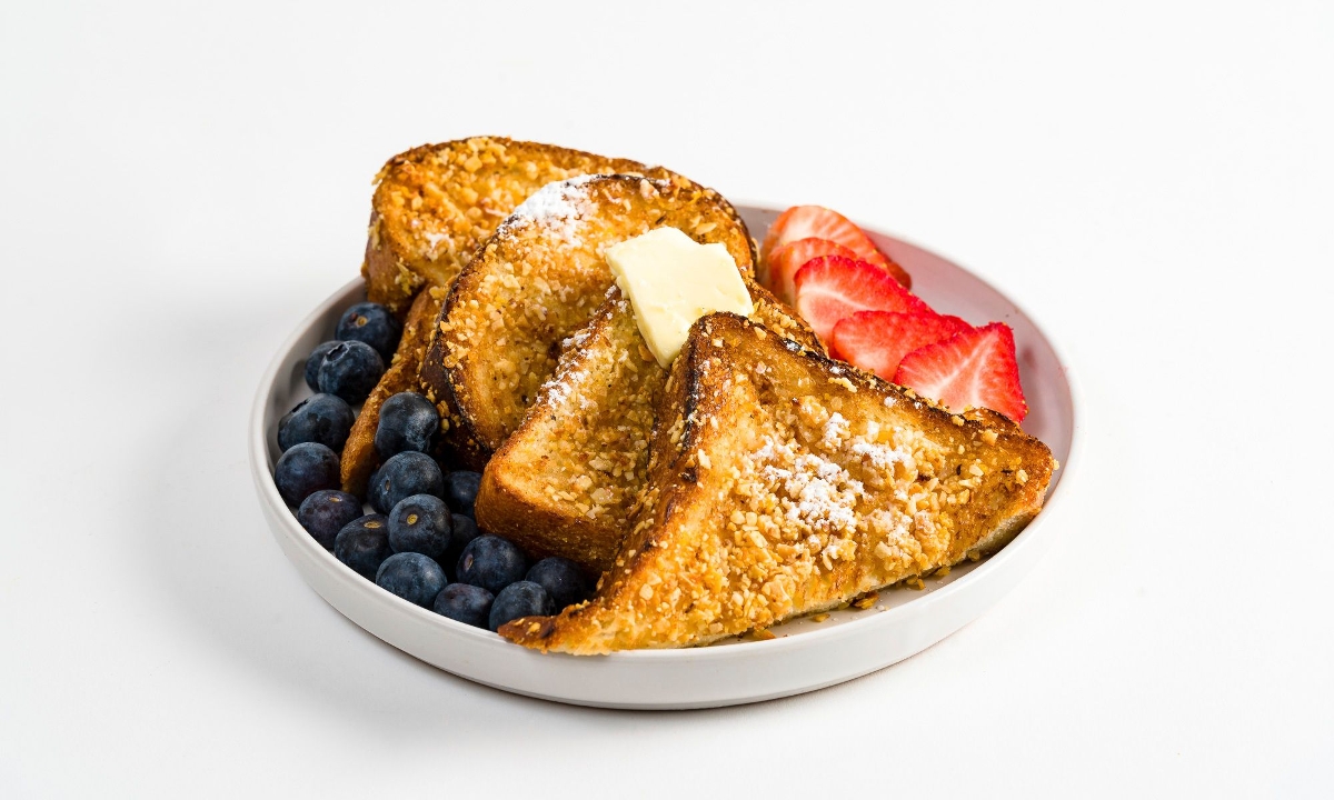 Sliced Challah French Toast with Powdered Sugar & Fruit Garnish