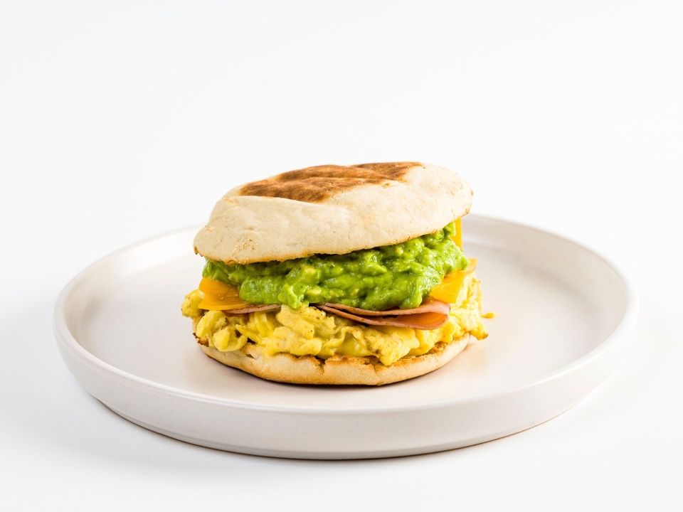 Two Eggs, Smashed Avocado, Country Ham, Cheddar Cheese on Jumbo English Muffin.