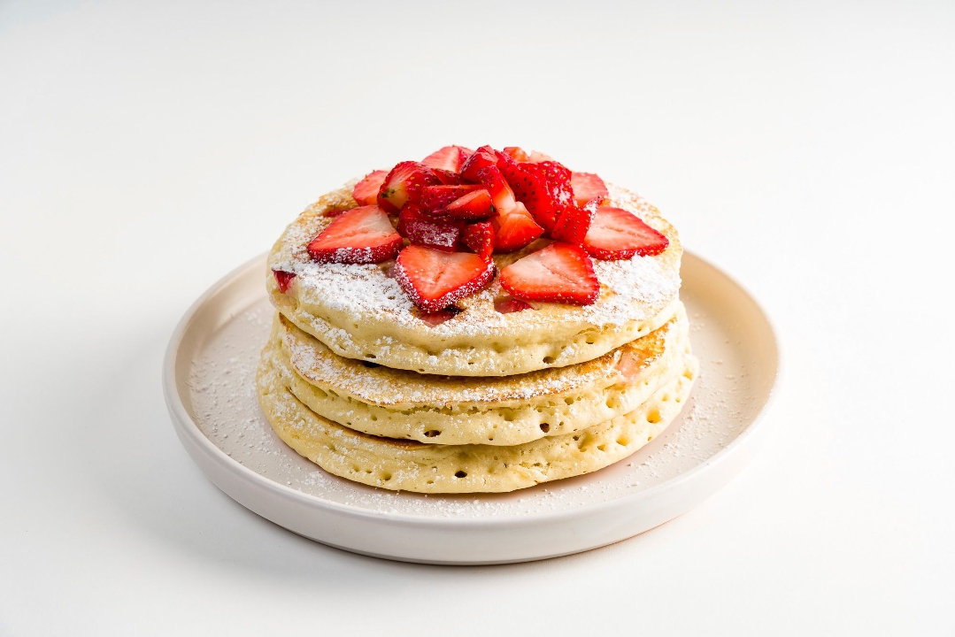Stack of Buttermilk Pancakes with Strawberries & Powdered Sugar