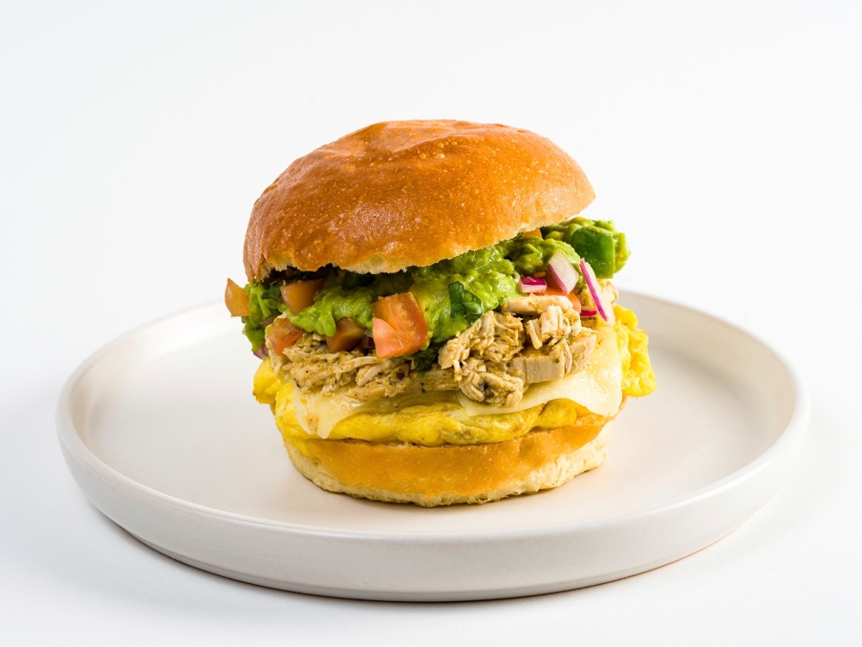Two Eggs, Spicy Chicken, Smashed Avocado, Pepper Jack Cheese & Pico de Gallo on Brioche.