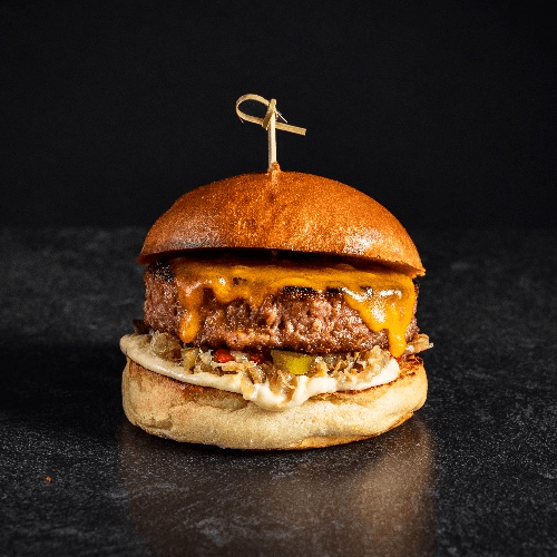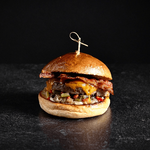 SLOW COOKED RIBEYE, CHEDDAR, ANGUS BEEF PATTY, PICKLE RELISH, CARAMELIZED ONIONS, BBQ SAUCE
