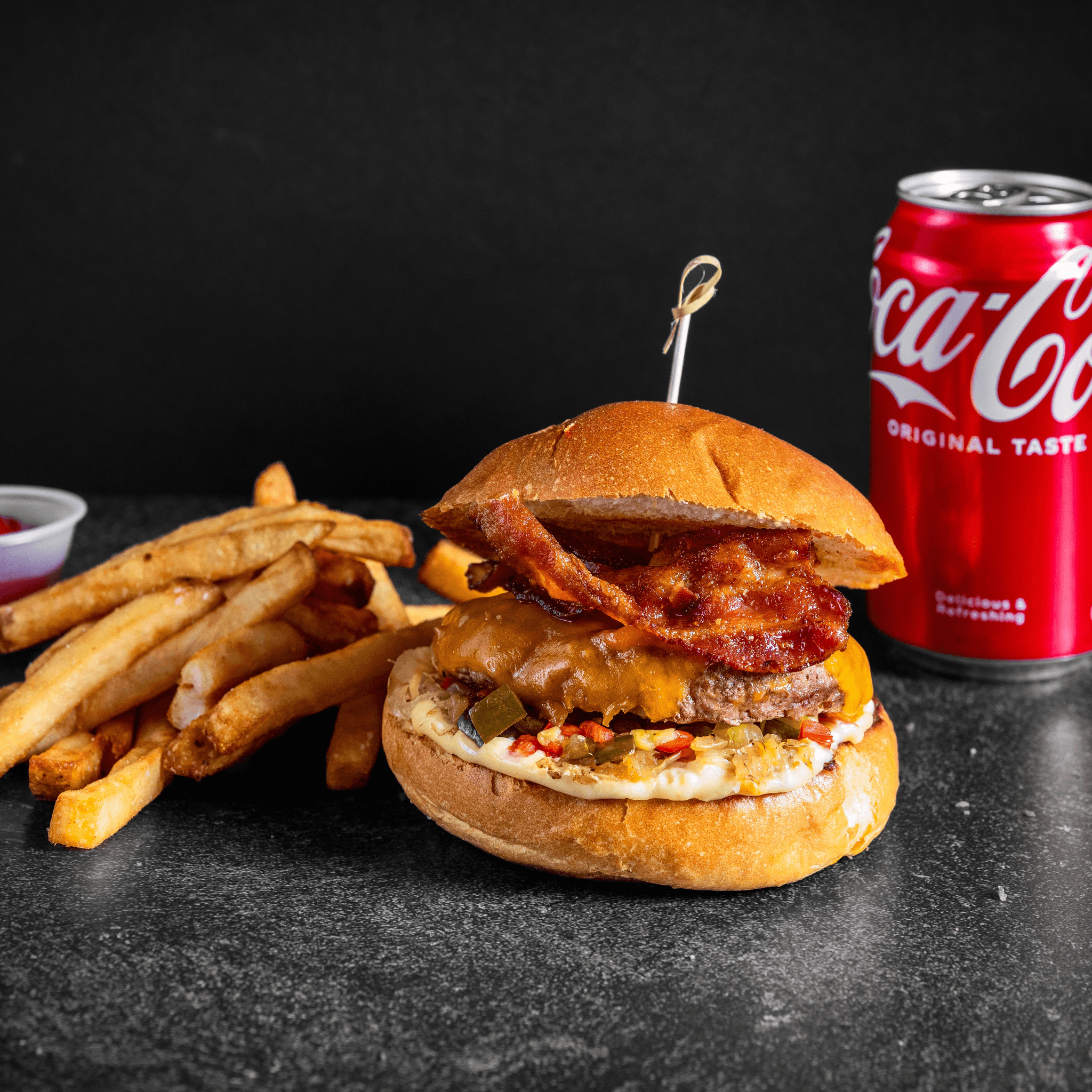 CHEDDAR, SIN SAUCE, CARAMELIZED ONIONS, PICKLE RELISH BACON + Skin-on fries & Can Soda