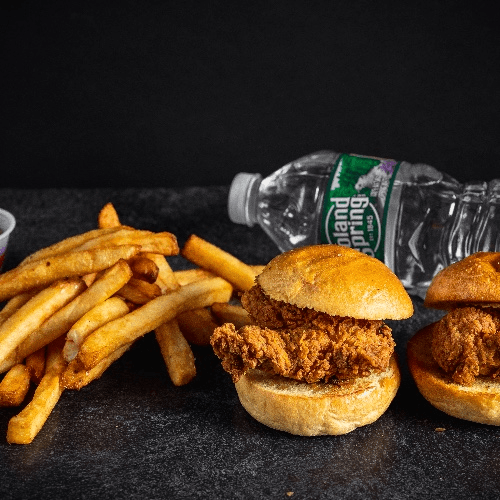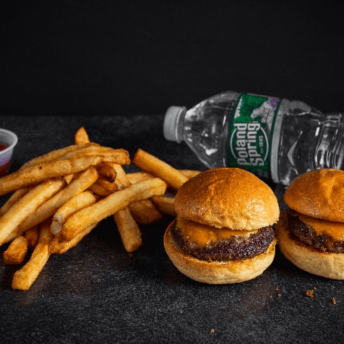 DOUBLE MEAT & CHEDDAR, SIN SAUCE, CARAMELIZED ONIONS, PICKLE RELISH + Skin-on fries & Can Soda