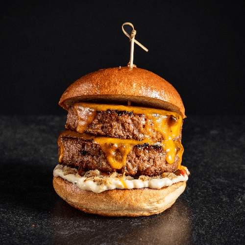 DOUBLE MEAT & CHEDDAR, SIN SAUCE, CARAMELIZED ONIONS, PICKLE RELISH