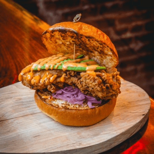 Pickled Red Onion, Spicy S.I.N. Sauce, Avocado, Cheddar