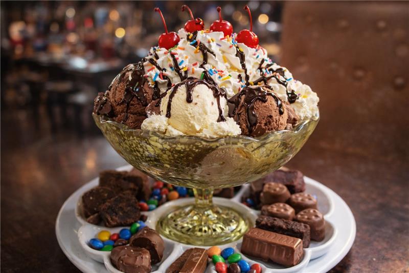Scoops of rich chocolate & vanilla ice cream piled high, chocolate sauce, whipped cream, sprinkles, maraschino cherries, a variety of chocolates & candy