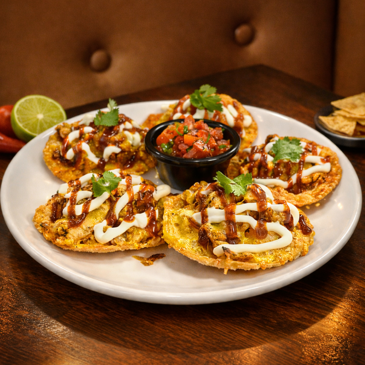Crispy gyoza skins topped with BBQ chicken, sautéed onions, blend of cheddar & Monterey Jack cheeses & drizzled with sour cream & BBQ sauce, served with pico de gallo