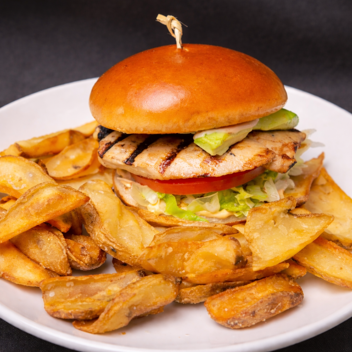 Grilled chicken breast topped with fresh avocado, lettuce, tomato & chipotle Sriracha ranch, served on a toasted brioche bun with seasoned fries