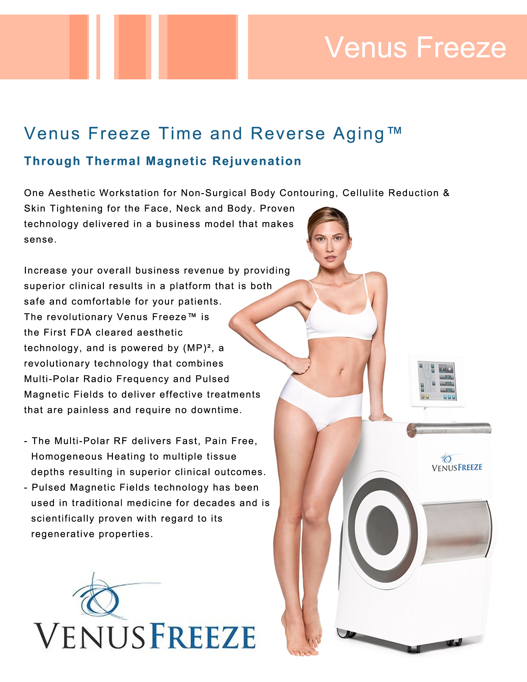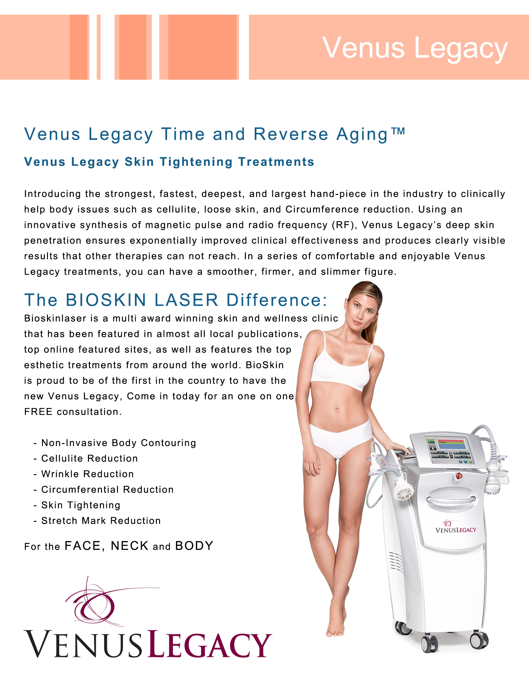 Bio Skin Laser introduces the newest Venus Technology, LiftFX and SculptFX BY VENUS LEGACY and VENUS FREEZE ! NO downtime, NO pain & NO discomfort. Non-invasive Body Contouring Cellulite Reduction Wrinkle Reduction Circumferential Reduction Skin Tightening Stretch Mark Reduction For the FACE, NECK & BODY Reduce volume and tighten skin for a more contoured arm. Reduce fluid around the eyes giving you a refreshed look. Reduce volume and tighten skin for a smoother jawline Contour and tighten your abdomen for a flatter and more defined stomach. Contour stubborn fat pockets to reduce your bra buldge. Reduce circumference and smooth cellulite for a tighter, smoother leg. Reduce cellulite, contour and lift your buttock for better shape.
