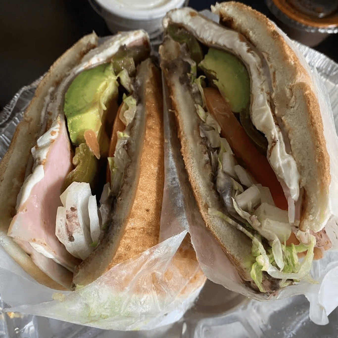Melted Oaxaca cheese and ham. It comes with refried black beans, tomatoes, lettuce, onions, mayonnaise, avocado, queso Oaxaca, pickled jalapeños, and french fries on the side