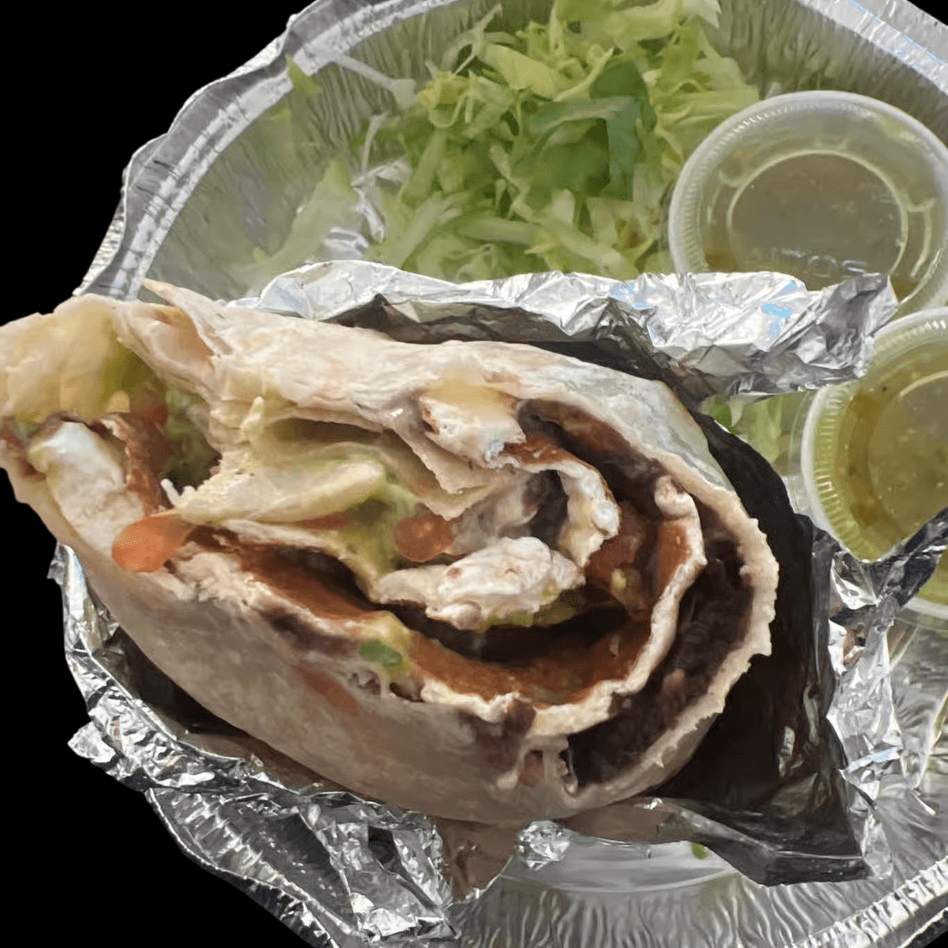 Ground beef. A soft 13-inch flour tortilla rolled and stuffed with yellow rice, refried black beans, pico de gallo, sour cream, jack cheese, and guacamole
