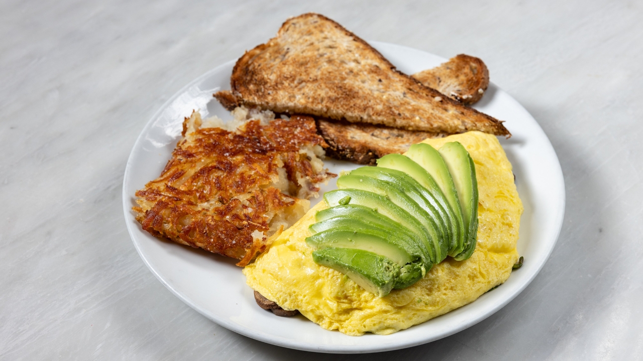 Spinach, mushroom, zucchini, squash, avocado, potato hash, whole wheat toast.