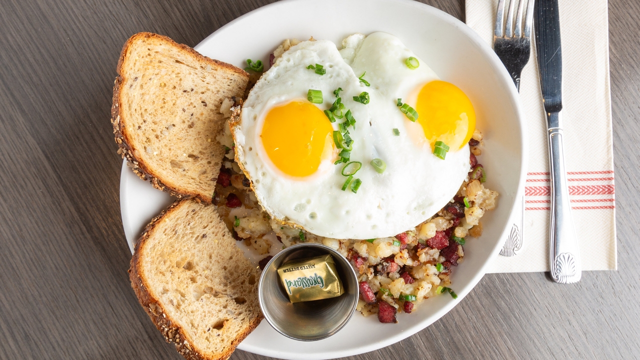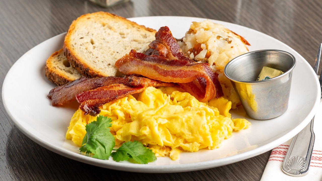 Two eggs, potato hash, whole wheat toast, choice of bacon, fruit or turkey bacon.