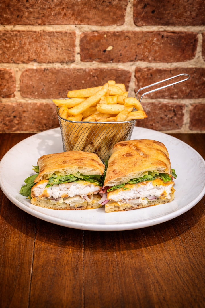 Blackened branzino, arugula, pickled fennel, pickled red onion, dill-caper aioli, ciabatta, herb fries.