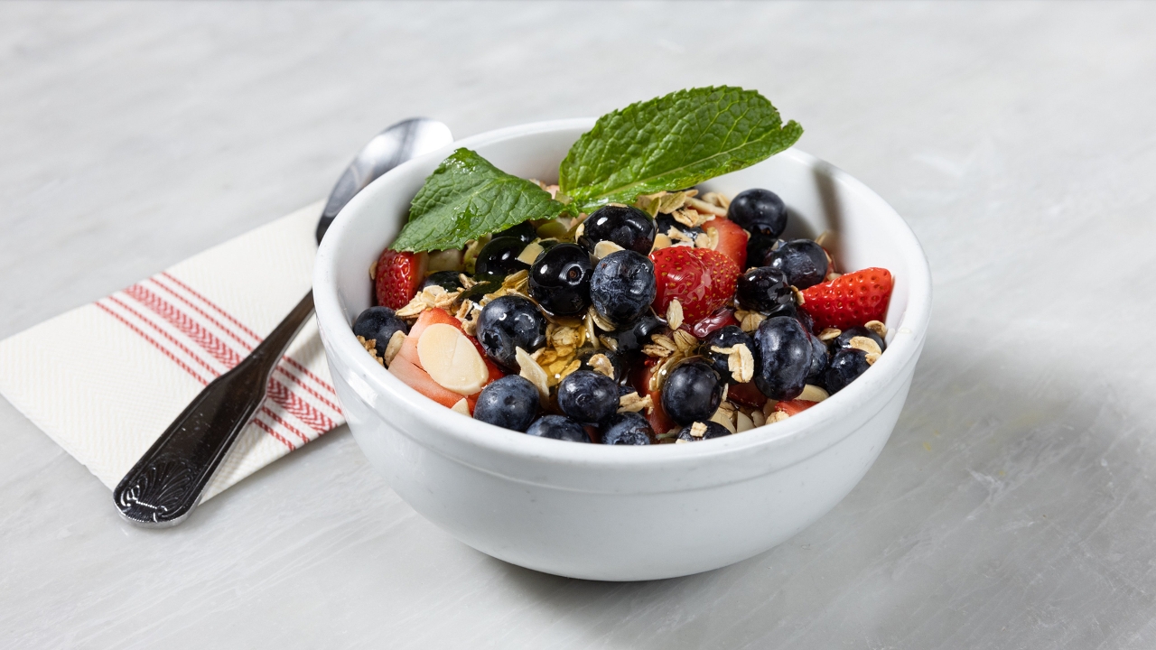 Greek yogurt, fresh berries, almonds, honey drizzle. (Gluten-free)