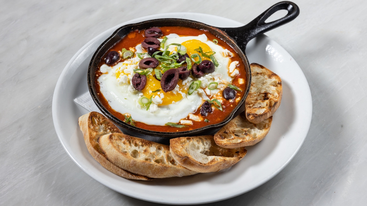 Sunny side eggs, tomato, peppers, olives, feta cheese, grilled ciabatta.