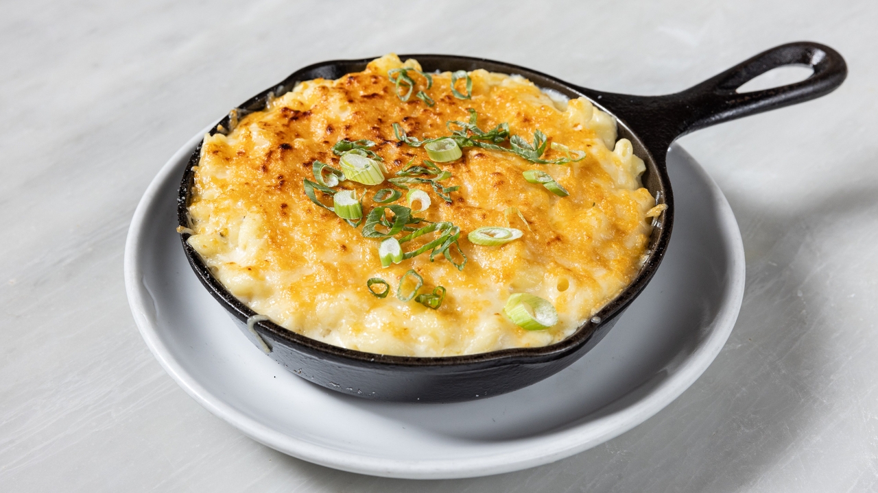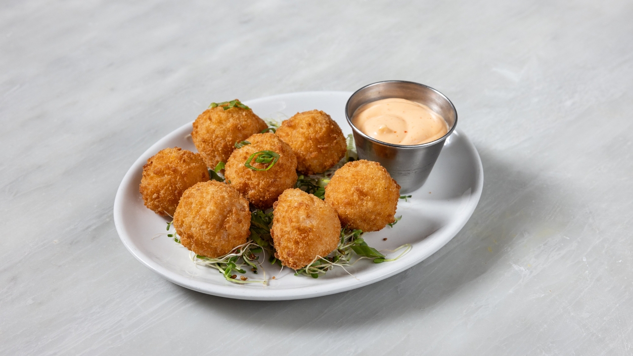 Deep fried 3 cheese mac and cheese balls with sriracha aioli on side. (Gluten-free)