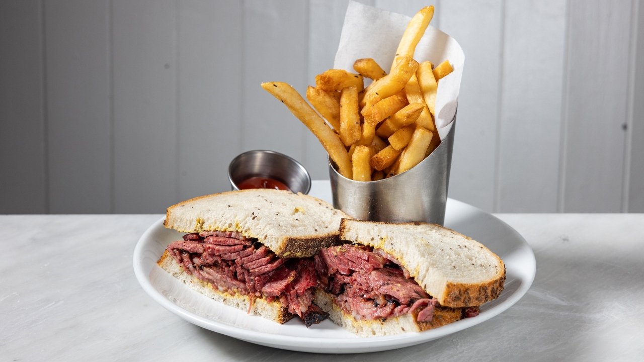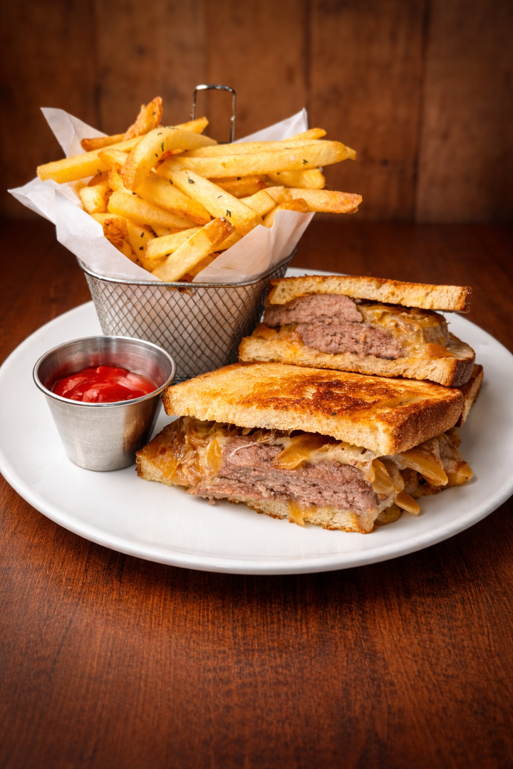 Angus beef, Caramelized onion, Swiss cheese, Russian dressing on sourdough, herb fries.