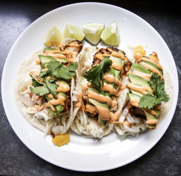 Fried COD, corn tortilla, guacamole, cabbage slaw, sriracha aioli, cilantro. 3 to an order. (Gluten-free)