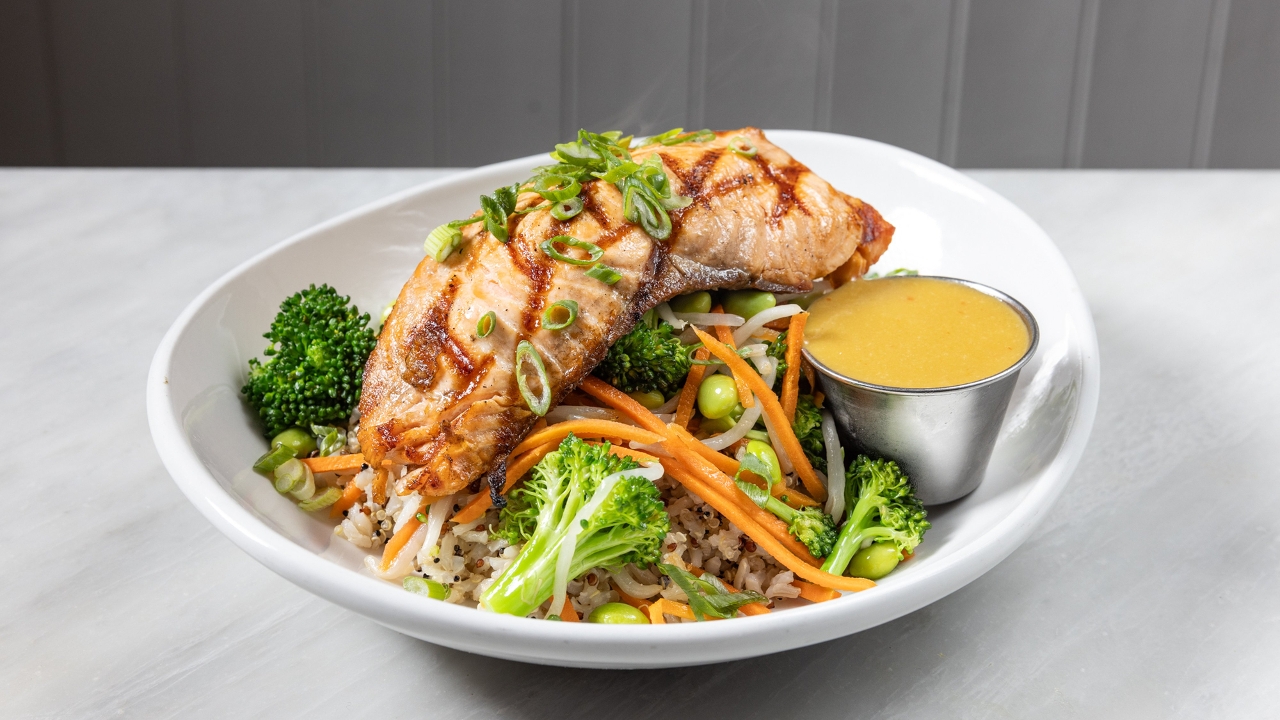 4 oz salmon, kale, grains, pickled beets, pickled carrots, avocado, edamame. Soy vinaigrette on the side. (Gluten-free)