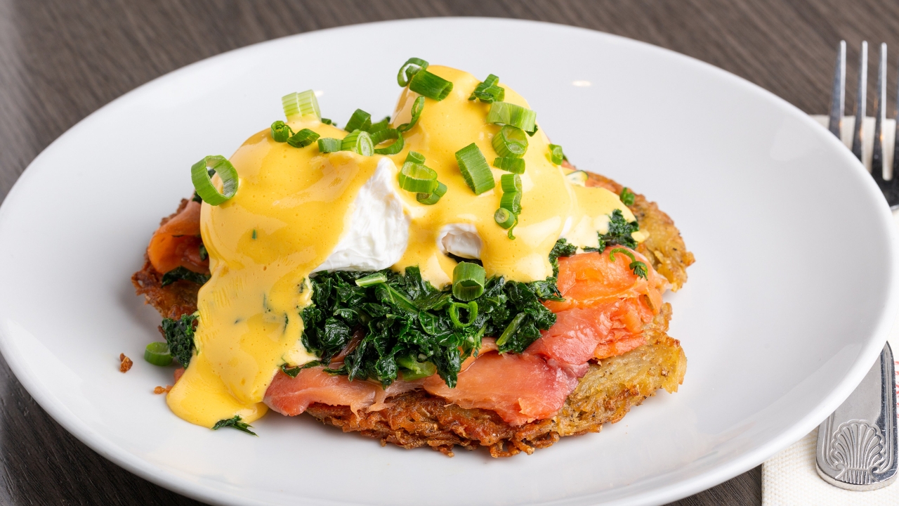 Poached eggs, smoked salmon, jumbo potato latke, baby kale, hollandaise. (Gluten-free)