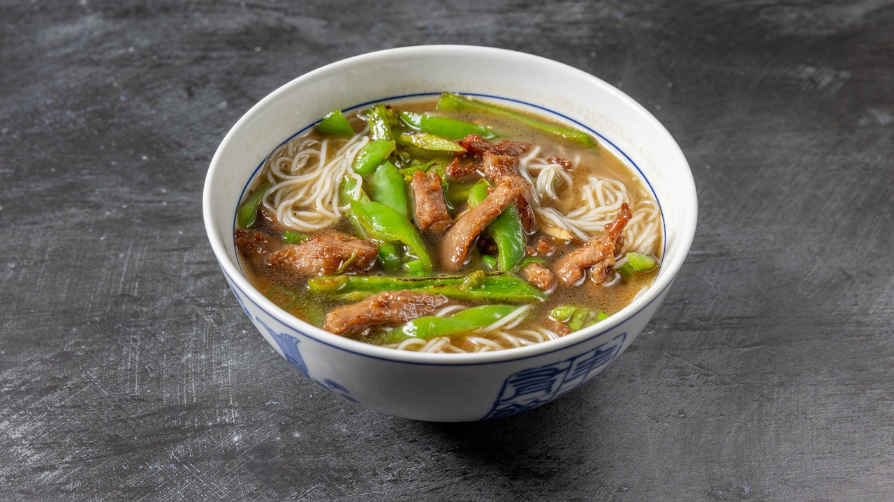 Shredded beef, chili peppers, bamboo, scallions. Made with wheat noodles.