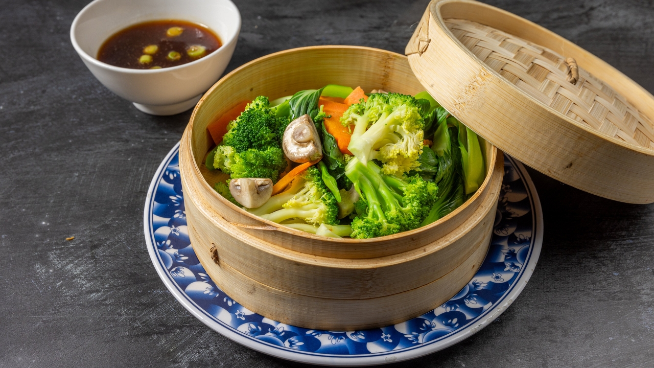 Steamed fresh broccoli, carrots, mushrooms, snow peas, bok choy and brown sauce on side. (Vegan)