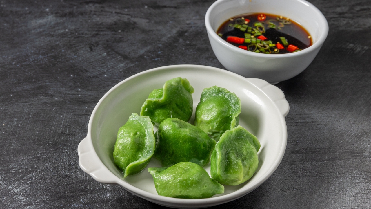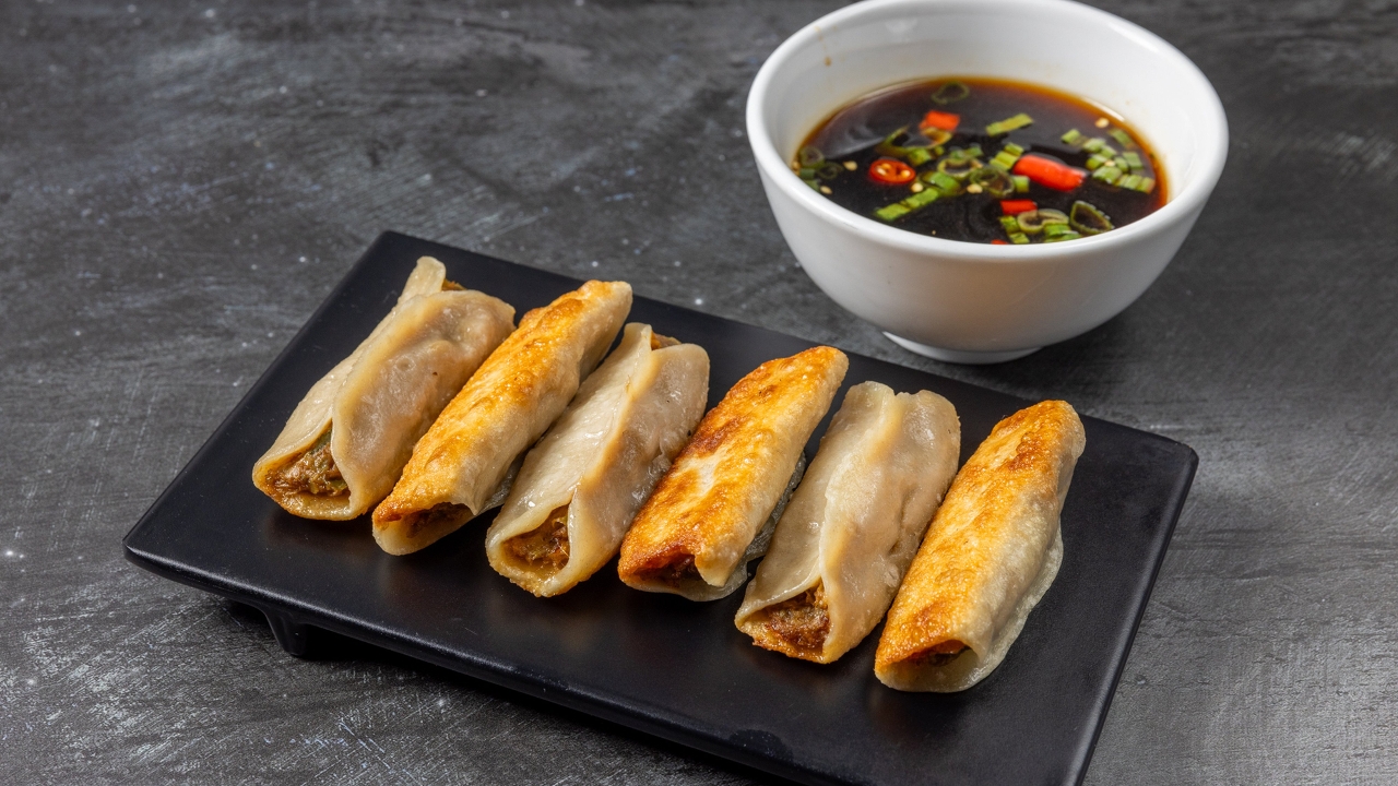 Classic fried dumpling, stuffed with Impossible (plant-based) meat. (Vegetarian)