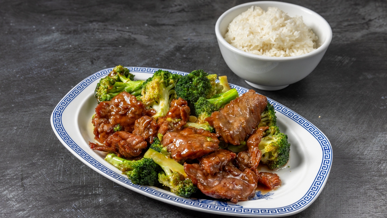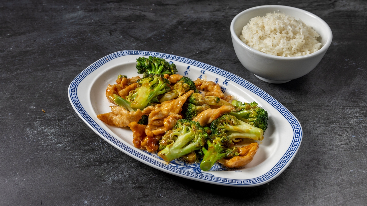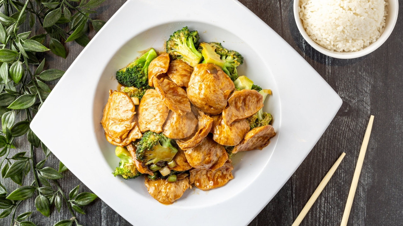 Classic soy-based chicken and broccoli with sauce, tossed in wok. (Vegetarian)
