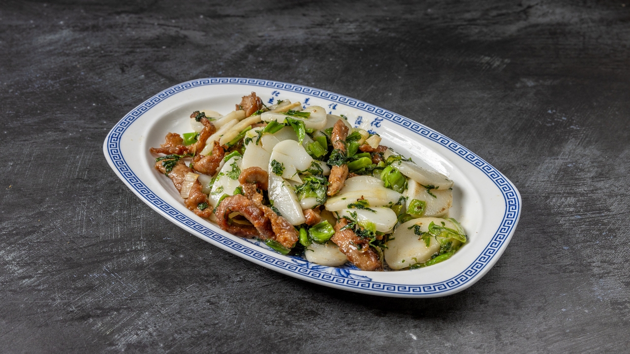 Shredded pork. bamboo, snow cabbage sautéed with rice cakes, in Cantonese style white sauce. (Gluten free)