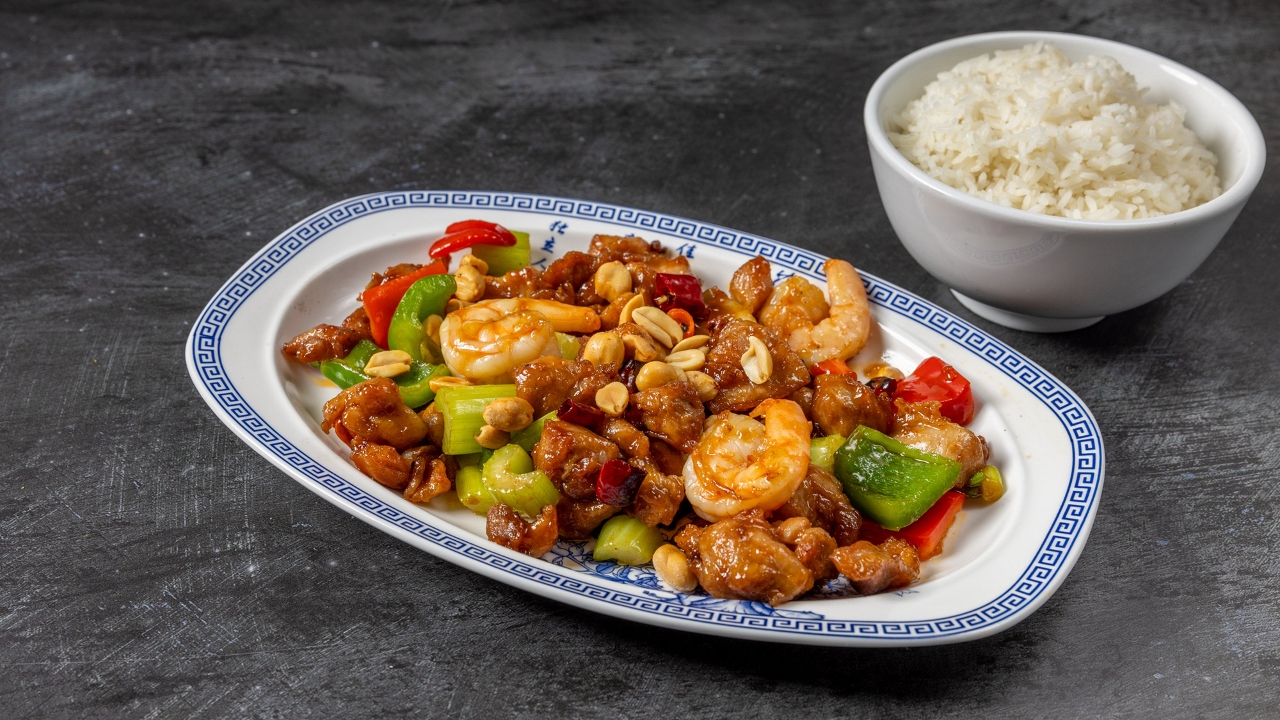 Chicken and shrimp and bell peppers with Kung Pao sauce. Contains peanuts. Spicy.