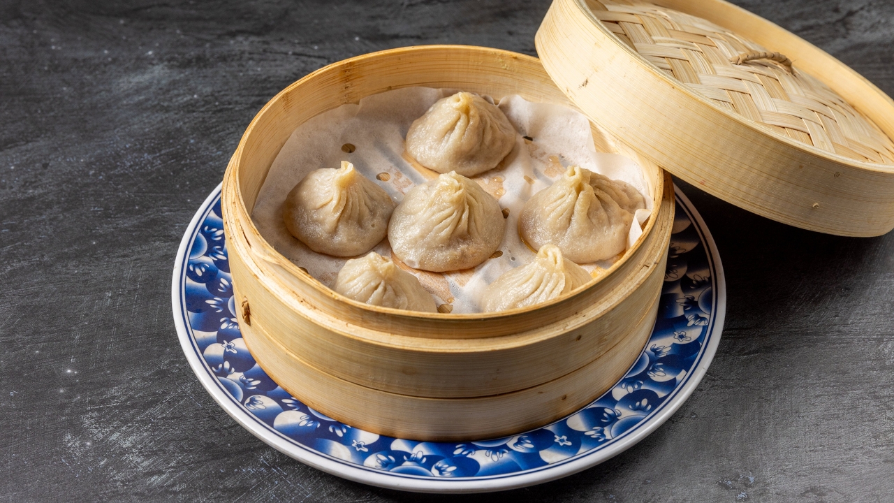Soup dumpling, featuring Impossible (plant-based) meat in vegetable broth. (Vegan)