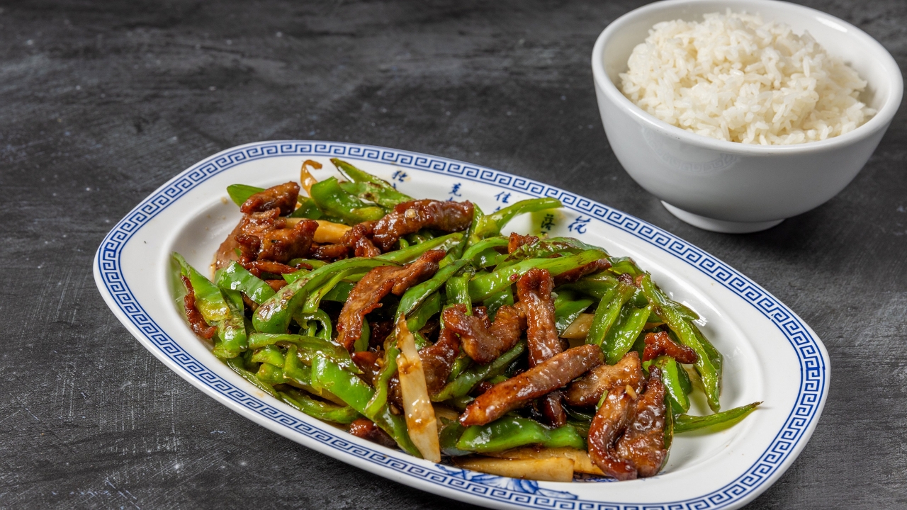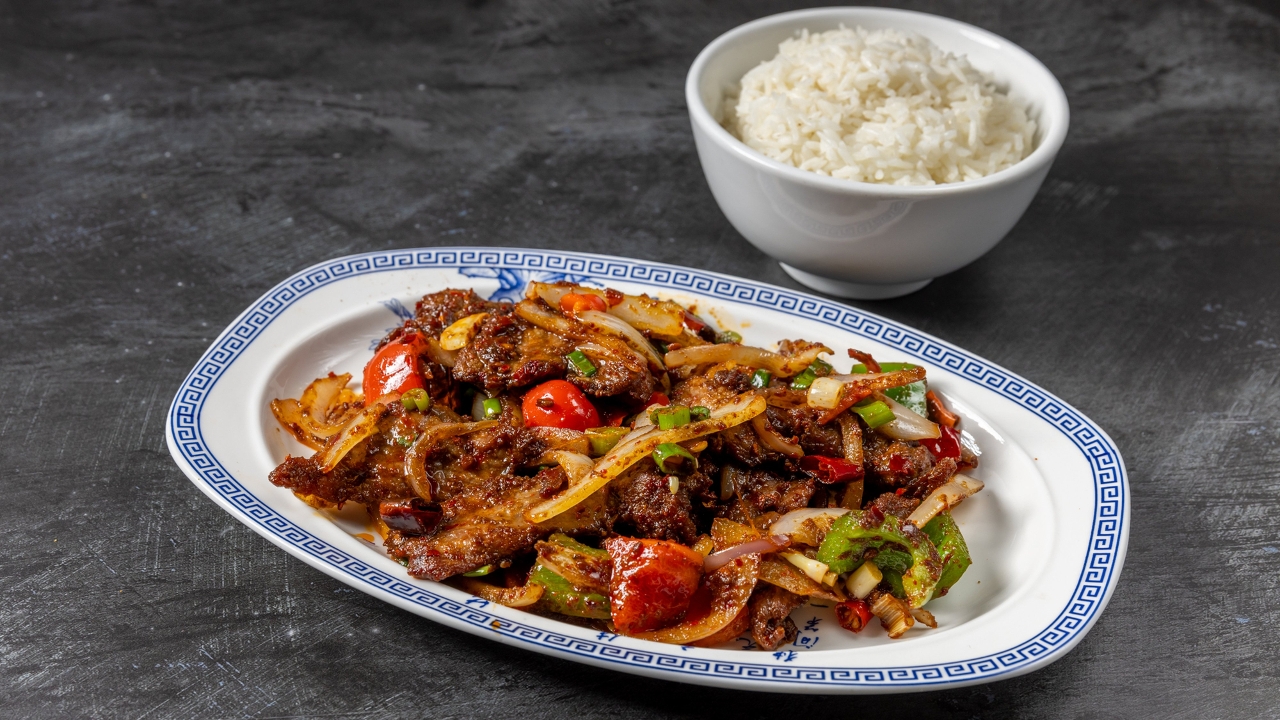 Thinly sliced beef stir-fried with onions, peppers, and spices.
