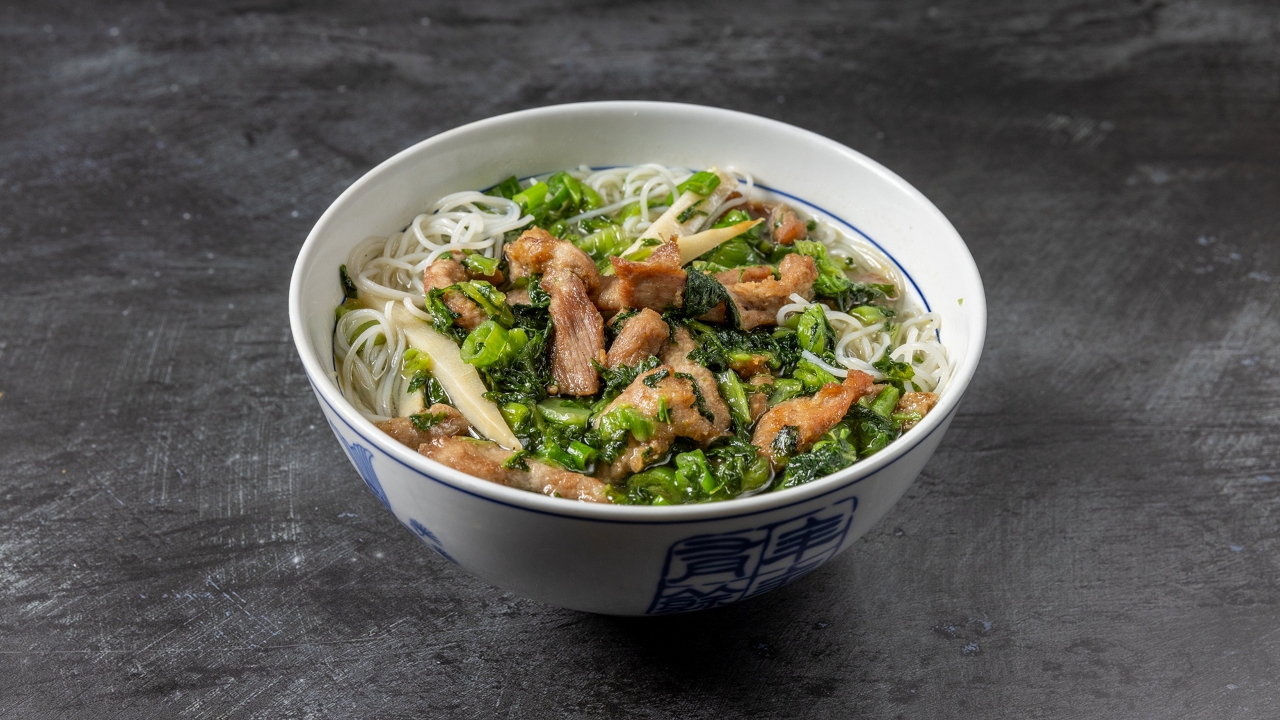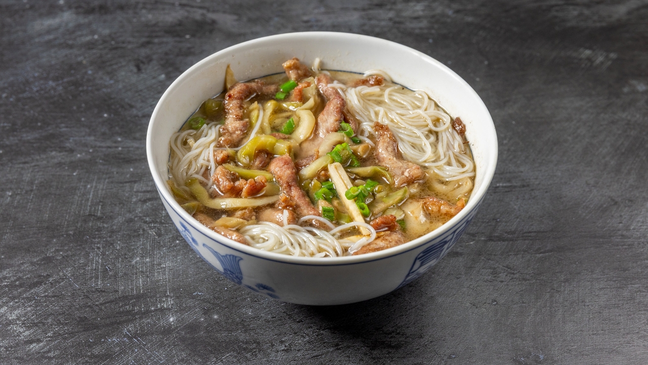 Shredded pork, bamboo and snow cabbage in chicken broth. Made with wheat noodles.