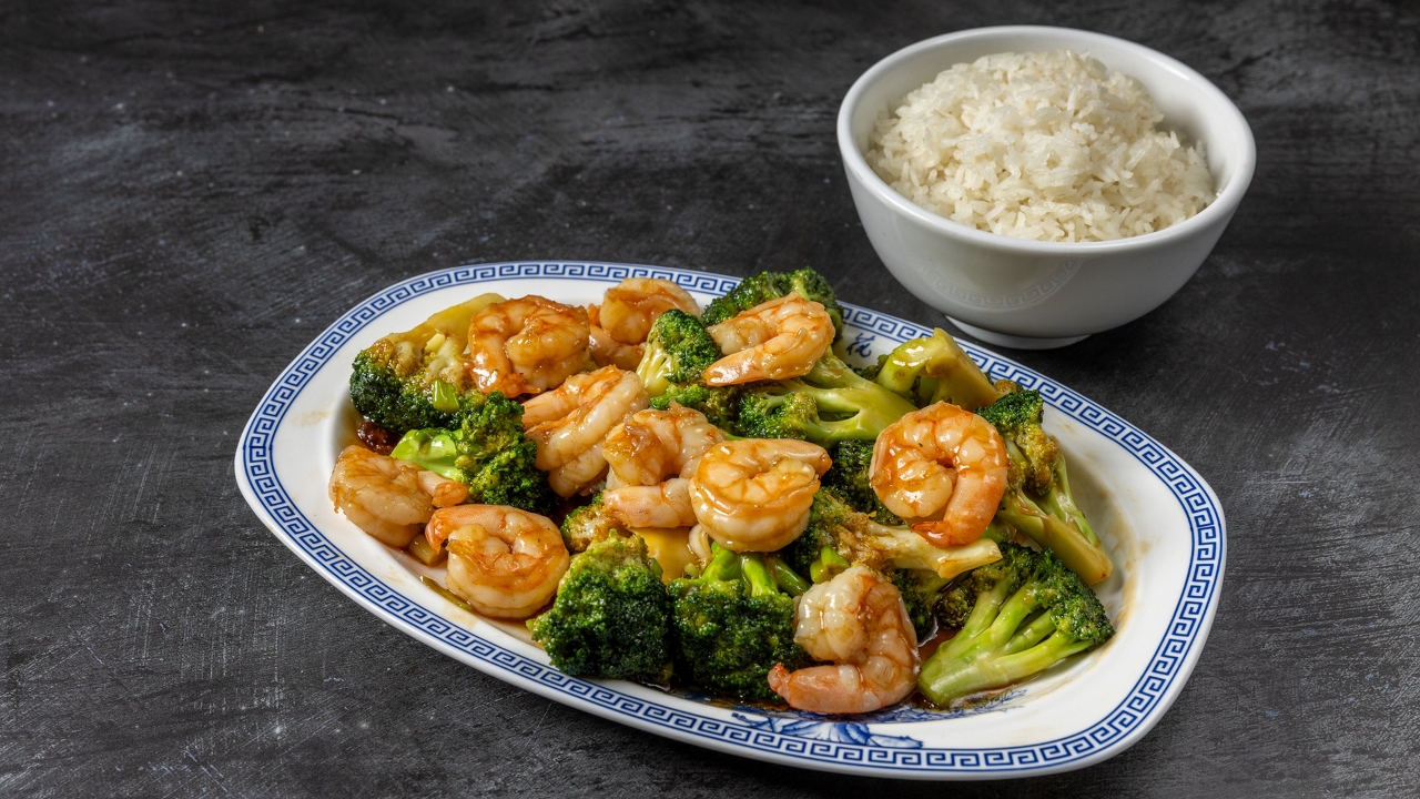 Gulf shrimp with broccoli, scallions, in classic brown sauce.