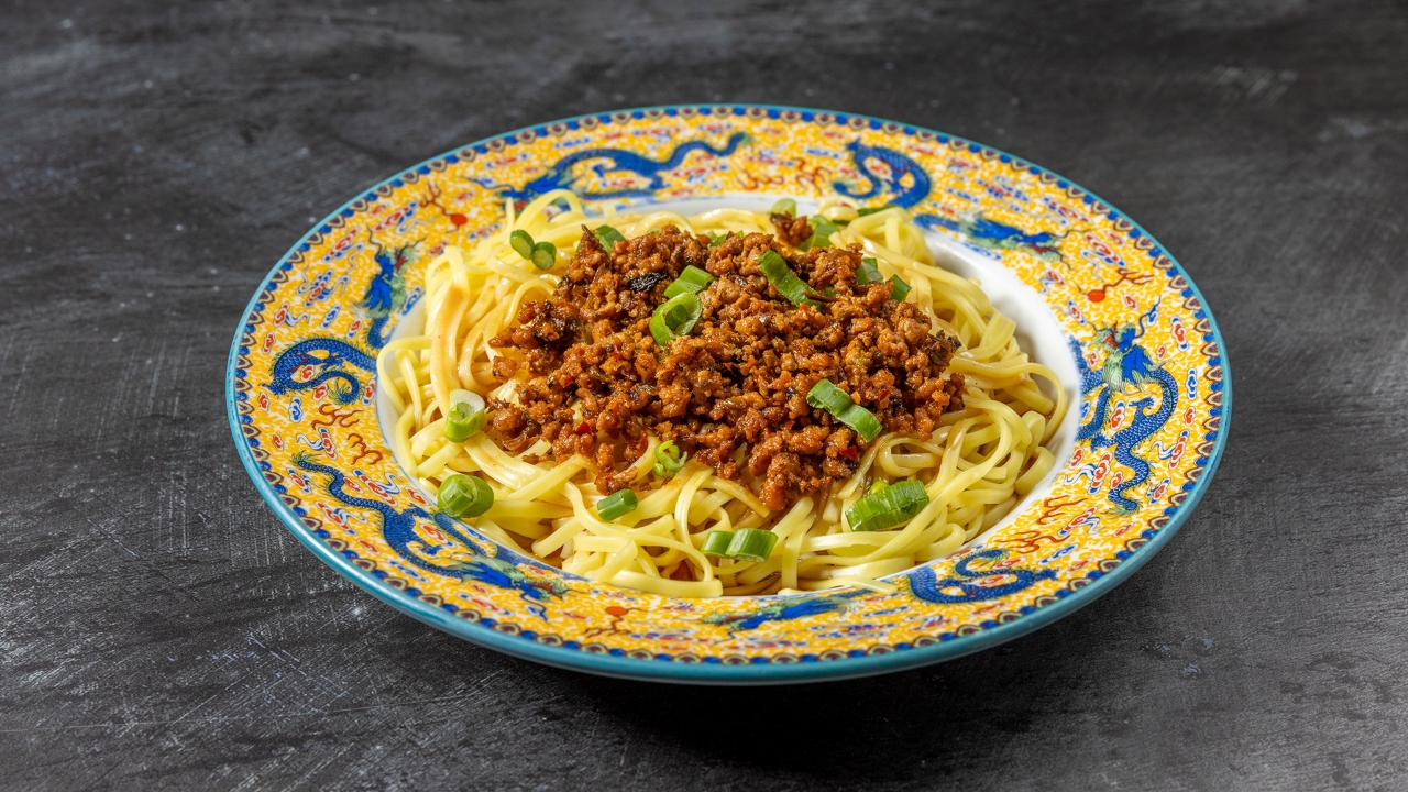 Lo mein noodles with ground pork and a spicy peanut chili oil sauce.