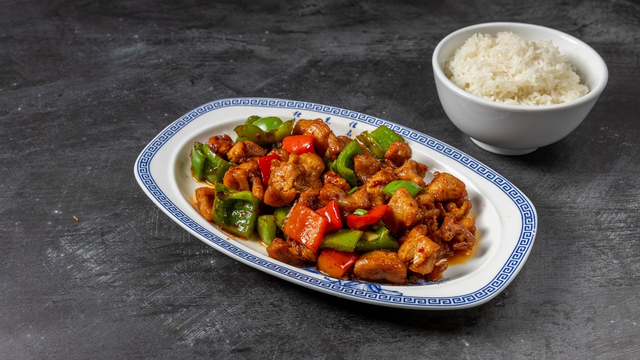 Chicken diced with and peppers and spices in Szechuan sauce. Spicy.