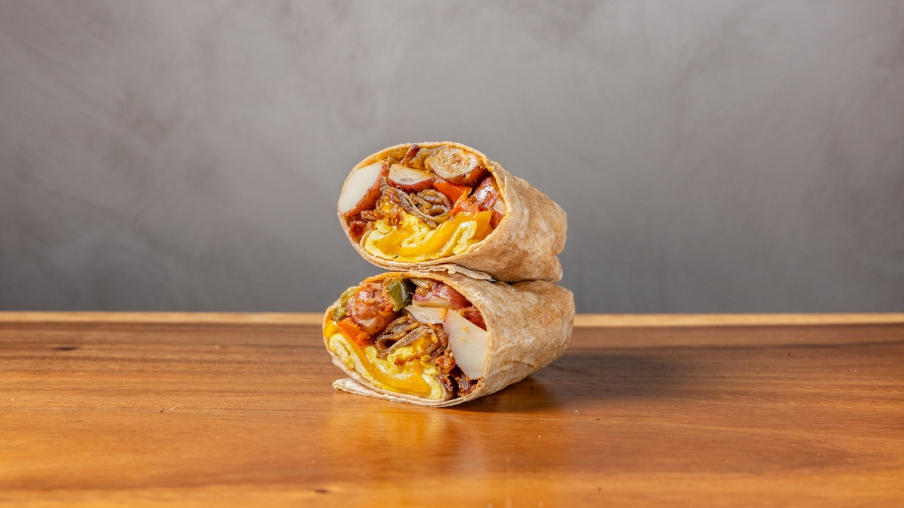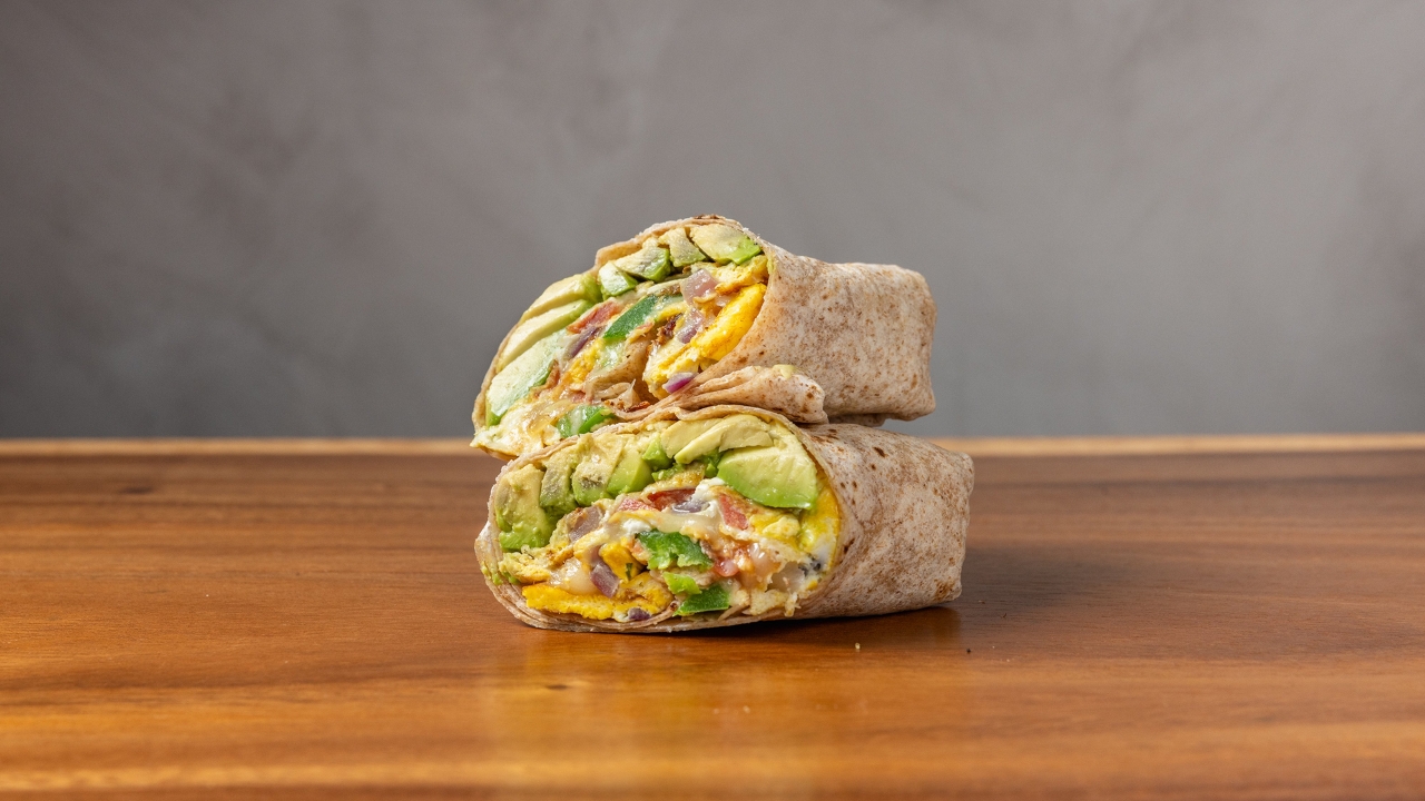 Scrambled eggs hash brown patty. 3 strips of bacon, American cheese, whole wheat wrap.