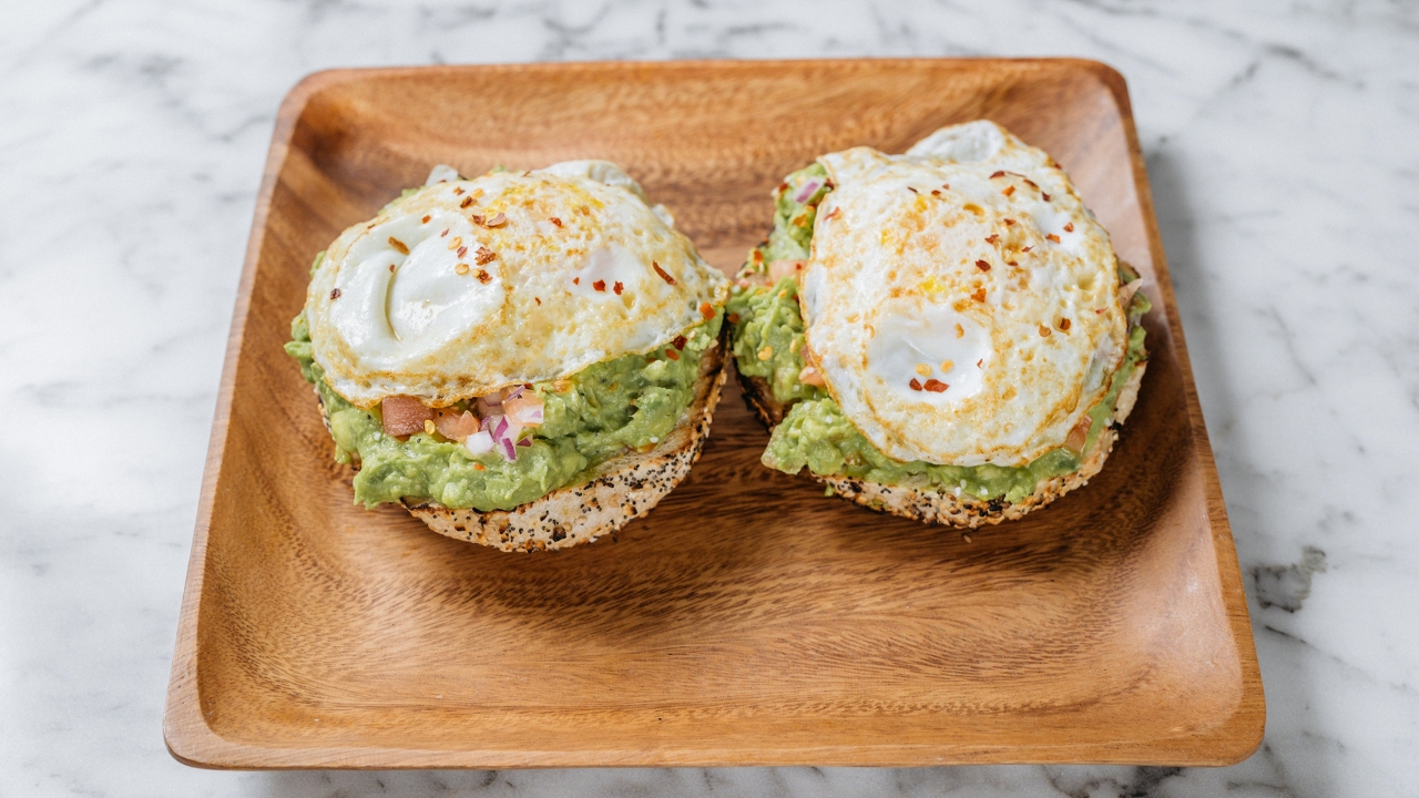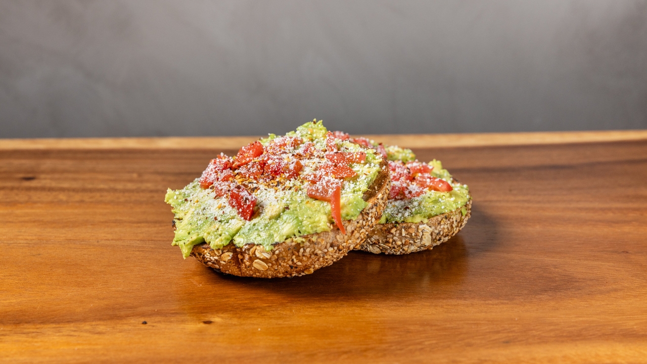 Smoked salomon, smashed avocado, chili flakes. Served on everything bagel, toasted open faced.