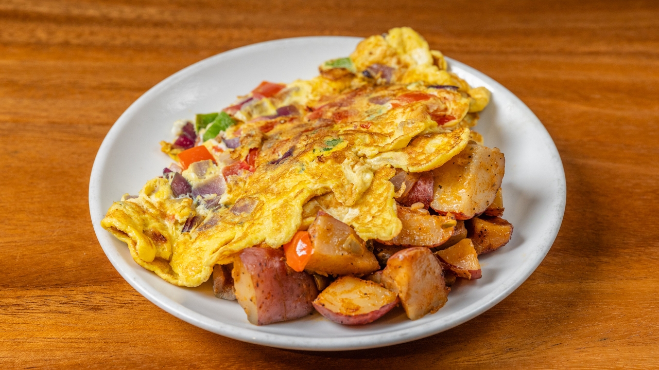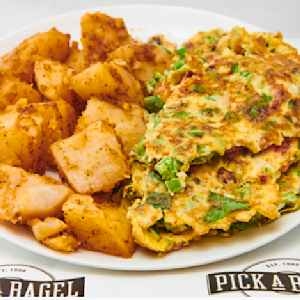 two Eggs,Onions, bell peppers, tomatoes,Served with home fries, & bagel with Butter.