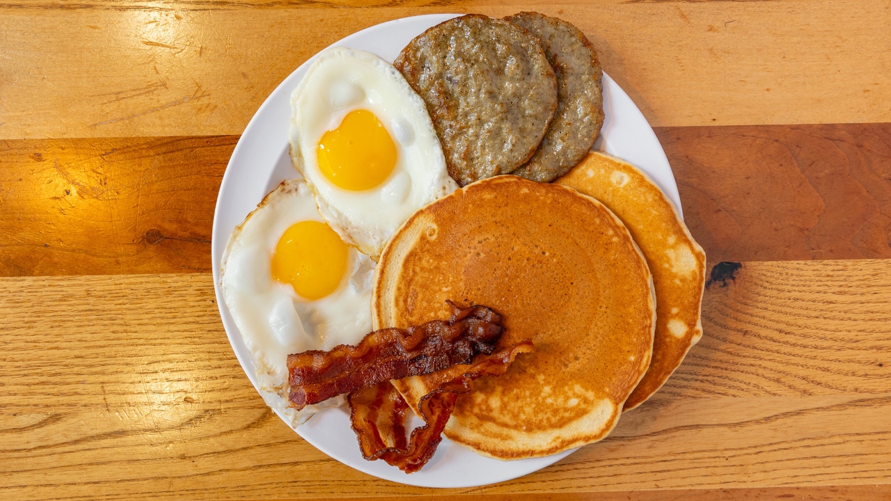 3 cinnamon pancakes, 3 eggs, and 3 strips of bacon, served with real maple syrup.
